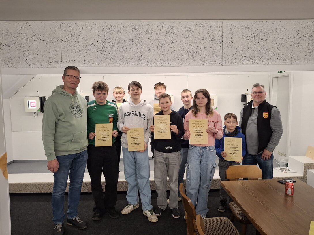 Gelungene Jahresabschlussfeier mit Siegerehrung der VereinsmeisterMit einer stimmungsvollen Jahresabschlussfeier und der feierlichen Siegerehrung der Vereinsmeisterschaft ließen die Sportschützen das vergangene Sportjahr ausklingen. Zahlreiche Mitglieder aller Altersklassen nahmen an der Veranstaltung teil und sorgten für einen rundum gelungenen Abend.Den Auftakt machten die Nachwuchsschützen. In geselliger Runde feierten sie bei Pizza und Softdrinks ihre sportlichen Erfolge. Ein besonderer Höhepunkt war die Auszeichnung des Nachwuchsschützen, die für ihre Leistungen bei der Vereinsmeisterschaft geehrt wurden. Stolz nahmen die jungen Schützinnen und Schützen ihre Urkunden entgegen.Vereinsmeister der Jungschützen wurde in der Disziplin: